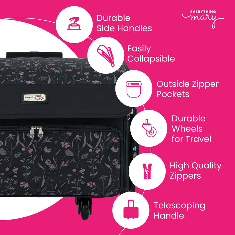 The Everything Mary 4 Wheel Collapsible Deluxe Sewing Machine Storage Case is the perfect option for traveling with your sewing machine. This sewing machine trolley is constructed with a beautiful, high-quality polyester material that is smudge-proof and super easy to clean. This carrying machine case keeps your valuable Brother, Singer, Babylock, Viking, or any other brand sewing machine protected. In addition to being a large sewing machine storage space, this case packs a mighty punch for storing notions, accessories, and more. Our sewing rolling bags travel easily with 4 wheels that spin 360 degrees. The Everything Mary 4 Wheel Collapsible Deluxe Sewing Machine Storage Case was made with crafters in mind.