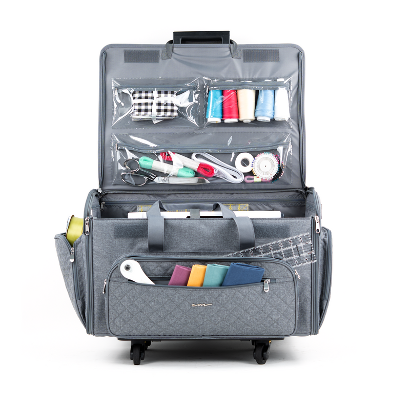 Travel beautifully and keep your creativity organized with the Everything Mary XXL Rolling Sewing Machine Case in Grey Quilted. Designed to fit large Brother, Singer, Bernina, and Janome machines, this premium tote combines durable protection with elegant style.